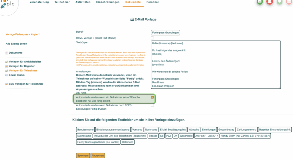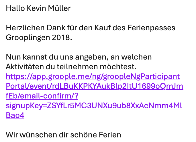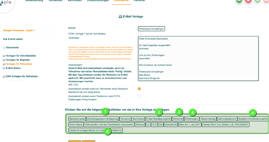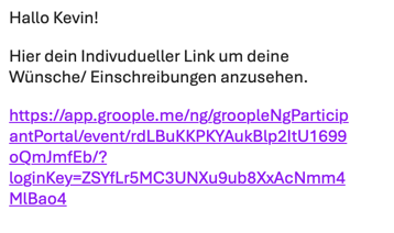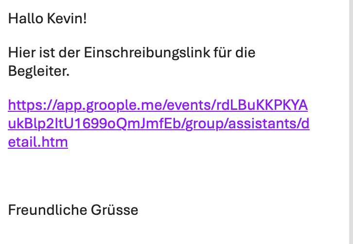 5. Anmeldelink für Begleitpersonen. Dieses Feld fügt den Anmeldelink für Begleitpersonen ein. Nach der Anmeldung können diese die Gruppen auswählen, die sie begleiten möchten. Dieses Feld kann jederzeit in die Pass-E-Mails eingefügt werden, ist jedoch besonders interessant in der E-Mail, in der die Zuweisungen an die Teilnehmer übermittelt werden.