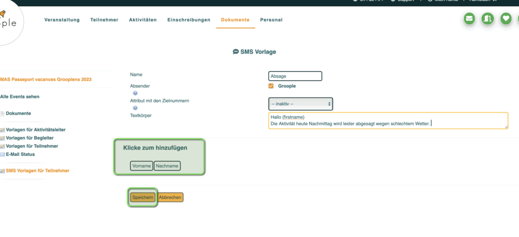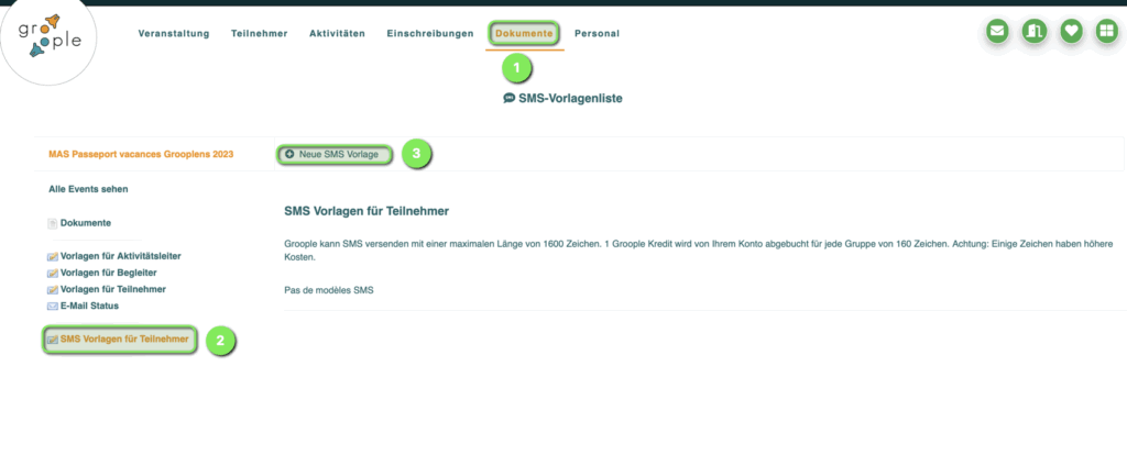 Béa Braun, die Veranstaltungsadministratorin, möchte die Teilnehmer per SMS über die Absage der Bogenschießaktivität informieren. Dazu muss sie zunächst Vorlagen erstellen.