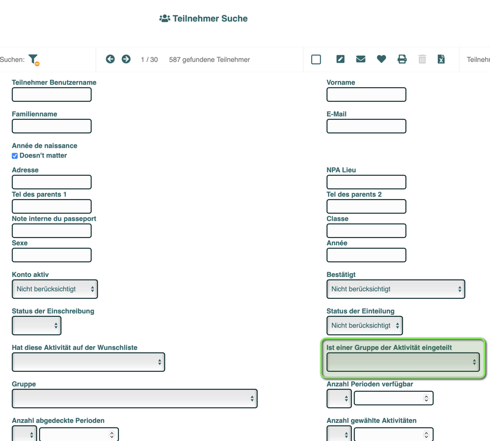 4. Einteilungen. Dieses Feld wird durch die Einteilungen des Teilnehmers ersetzt. Es ist vollständiger als das Feld {Zusammenfassung der Einteilungen}, da es insbesondere die Attribute der Aktivitäten anzeigt.