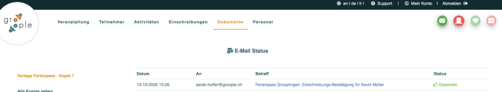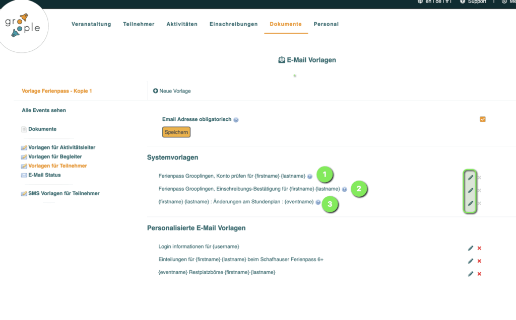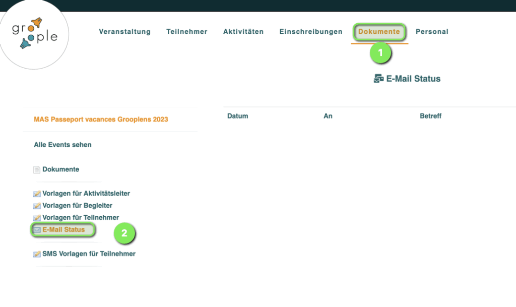 Groople verwaltet die Kommunikation mit den Teilnehmern und Begleitpersonen durch den Versand von personalisierten E-Mail-Serienbriefen, die teilweise automatisch versendet werden. Diese E-Mail basieren auf E-Mail-Vorlagen, die der Administrator ändern oder erstellen kann.