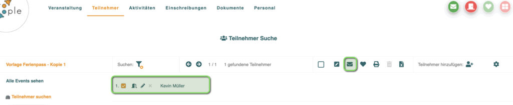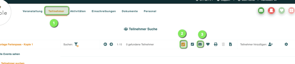 Um die vorbereiteten E-Mails zu versenden, öffnet Béa den Reiter „Teilnehmer“. Um alle Teilnehmer auszuwählen, kreuzen Sie den kleinen Kasten (2) an