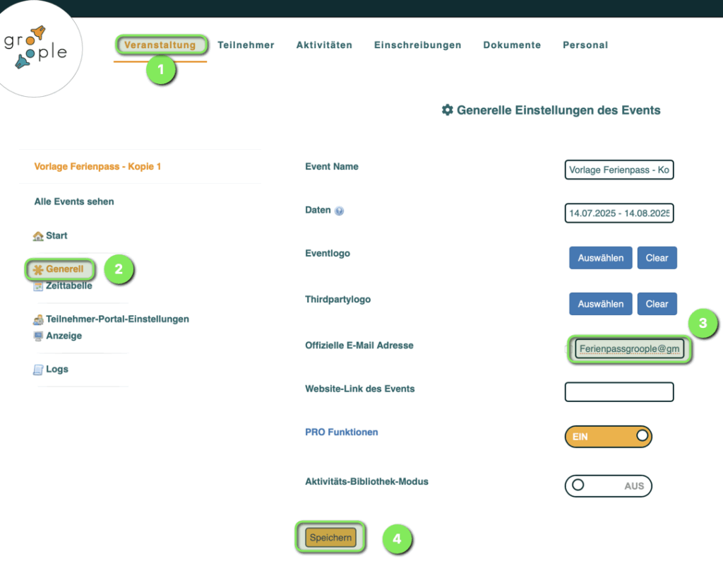 Béa, die Administratorin einer Organisation, konfiguriert die offizielle E-Mail-Adresse ihres Ferienpasses. Diese Adresse wird als Standard-Antwortadresse für E-Mails ihrer Teilnehmer, Aktivitätsleiter und Begleitpersonen verwendet.