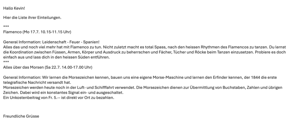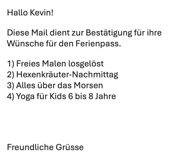 - Diese E-Mail wird automatisch versendet, wenn der Teilnehmer seine Auswahl getroffen hat
